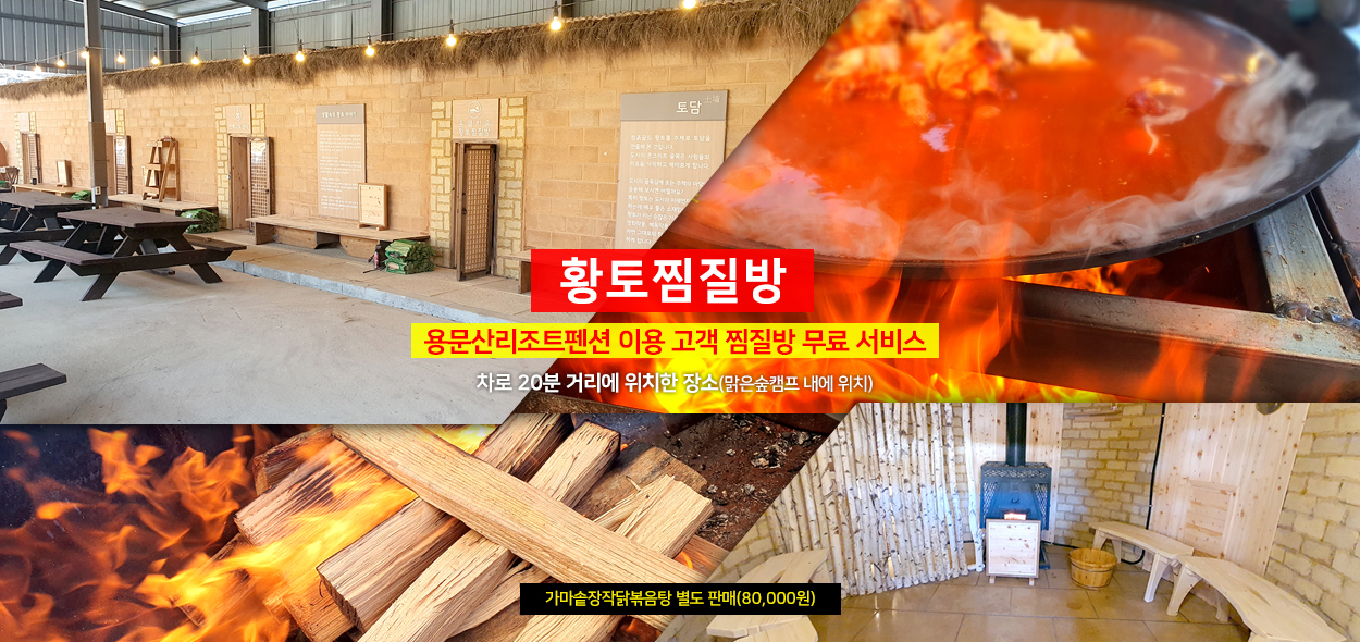펜션 숙박 + 항아리 훈제 코스바베큐 ▶ 대갈비살 ▶ 목살 ▶ 통삼겹 ▶ 이후부터는 삼겹살 추가 제공 + 가래떡(구이용) + 버섯 + 생맥주(무한) + 소주(무한) +