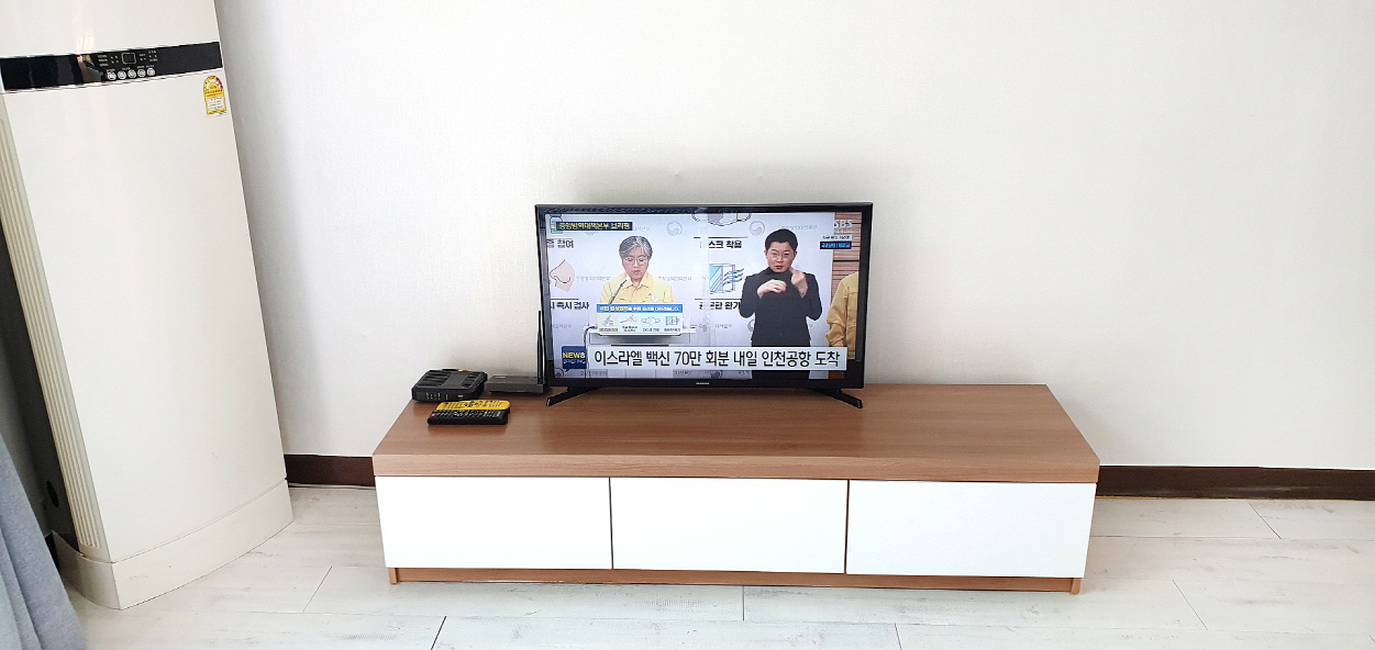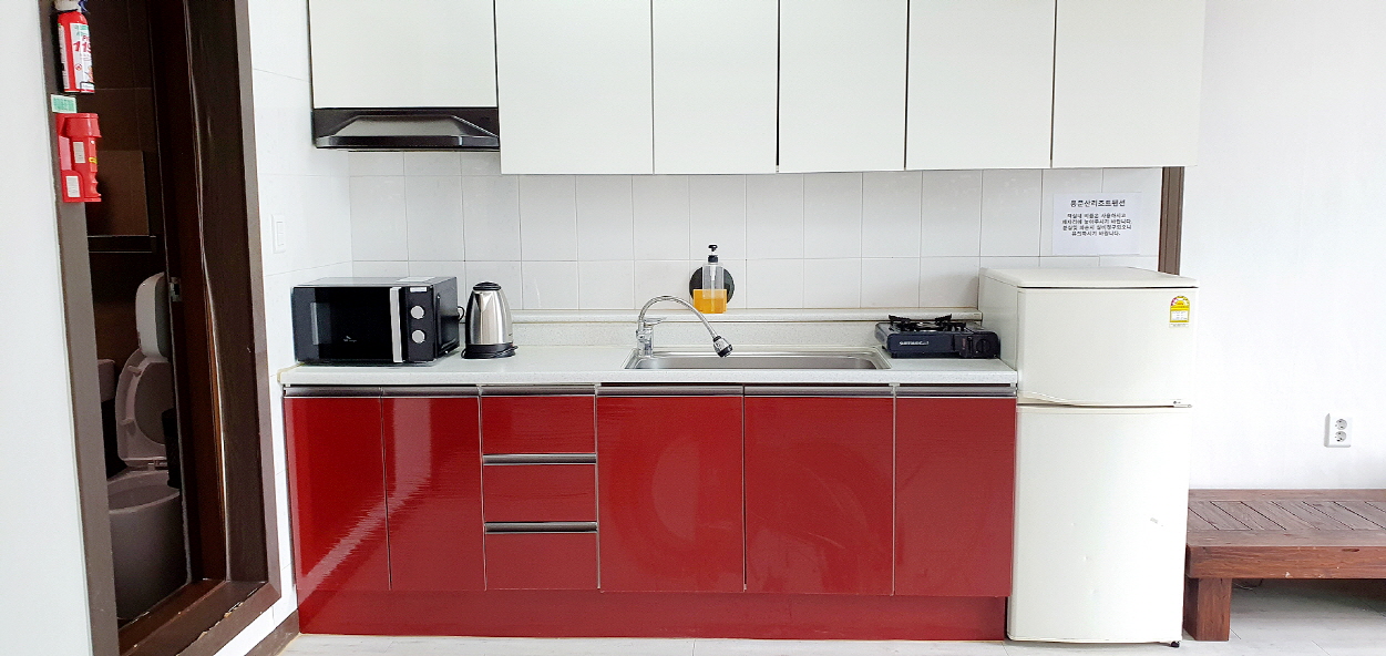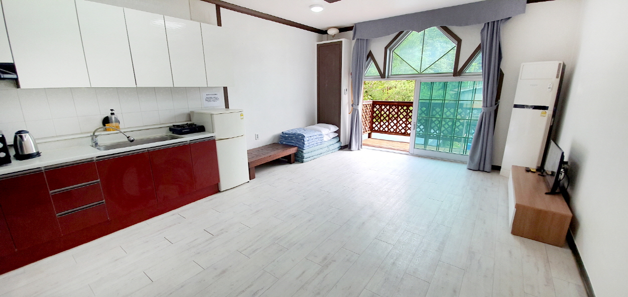 TV, 냉장고, 식탁, 에어콘, 전자렌지, 데크, 싱크대, 취사도구 일체