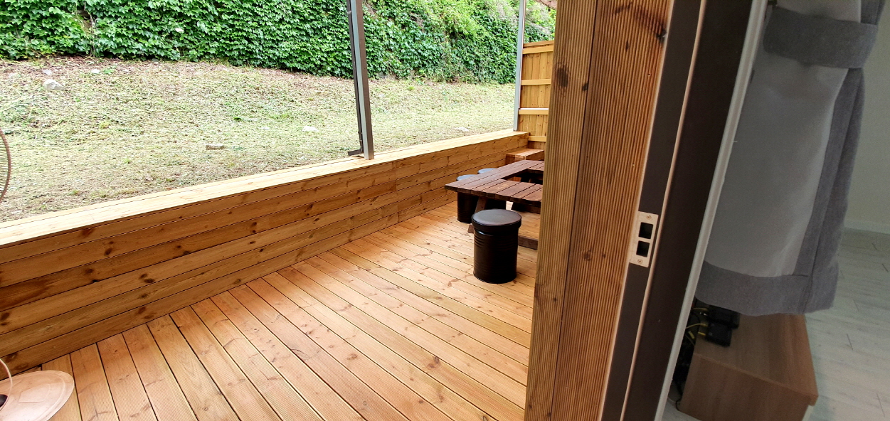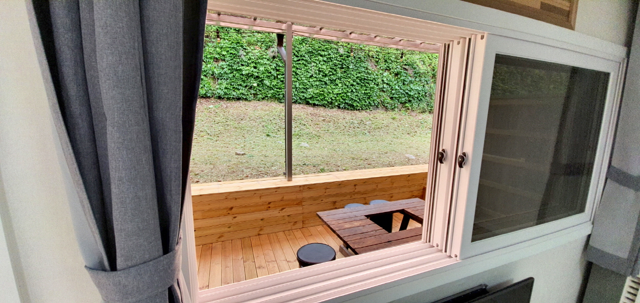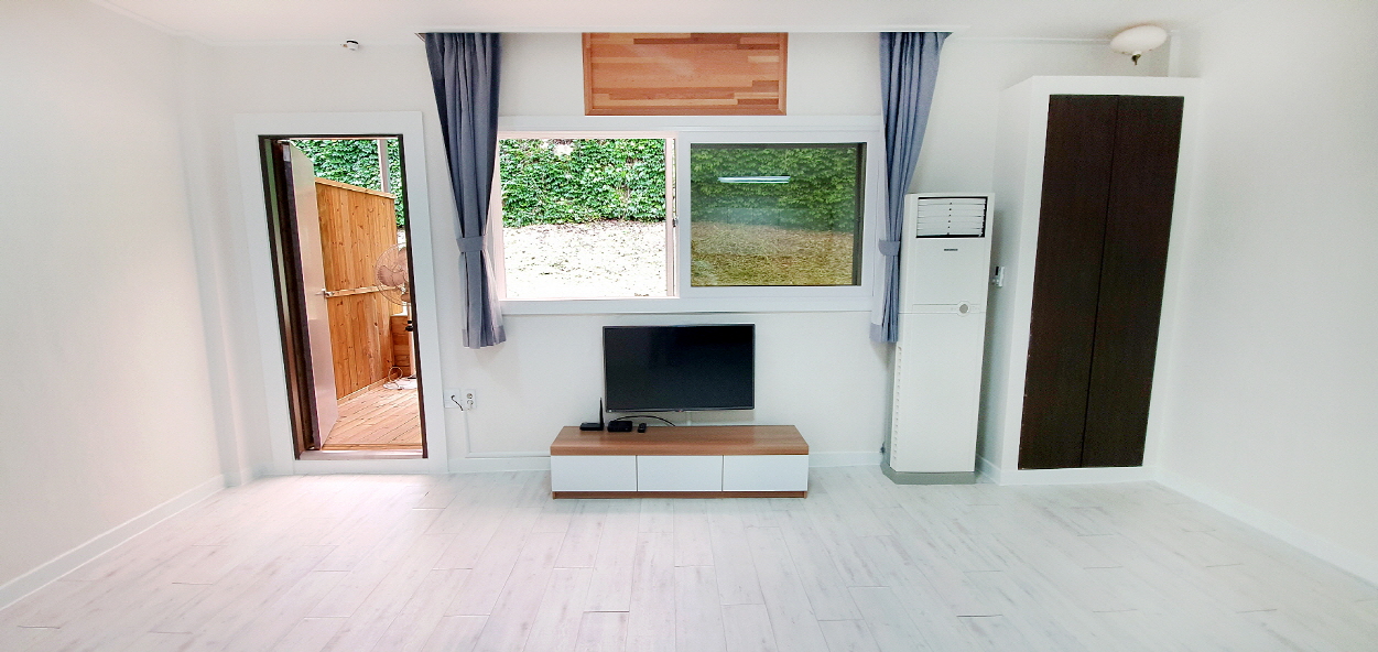 TV, 냉장고, 식탁, 에어콘, 전자렌지, 데크, 싱크대, 취사도구 일체