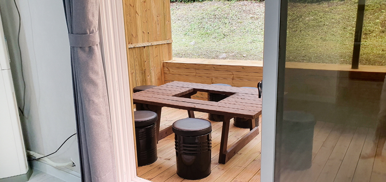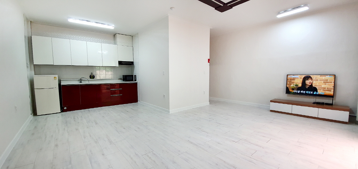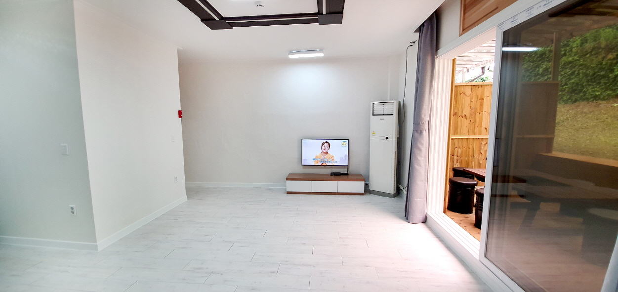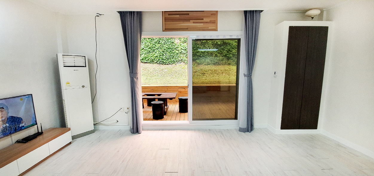 TV, 냉장고, 식탁, 에어콘, 전자렌지, 데크, 싱크대, 취사도구 일체