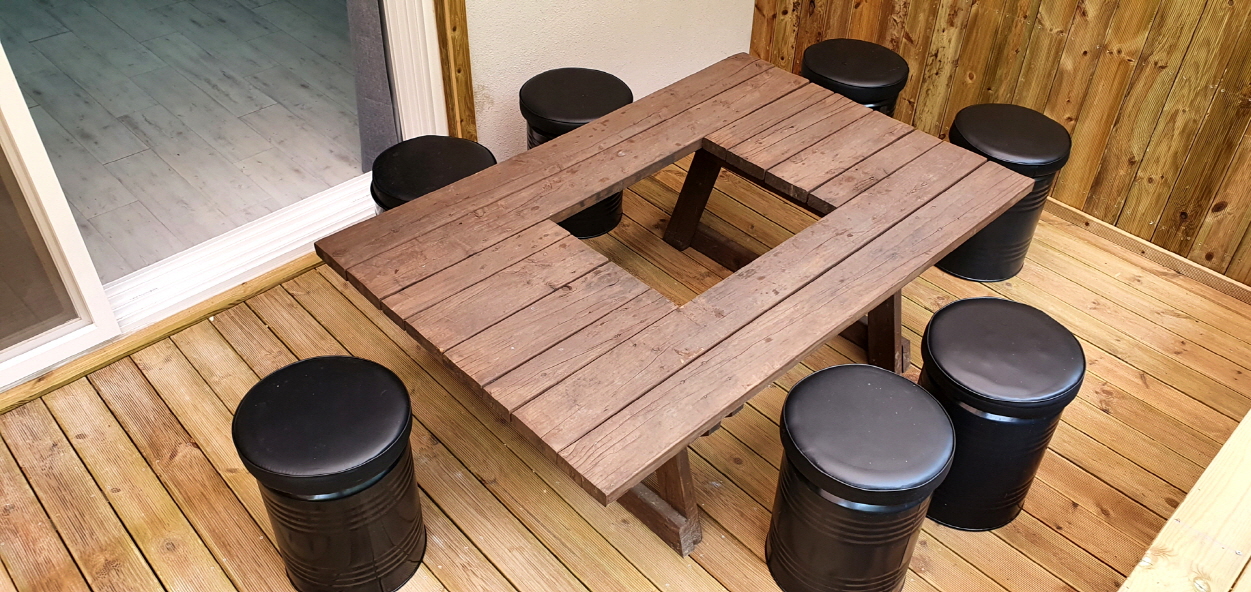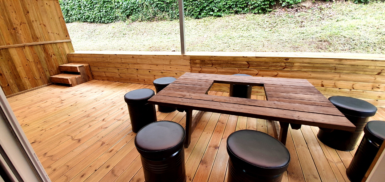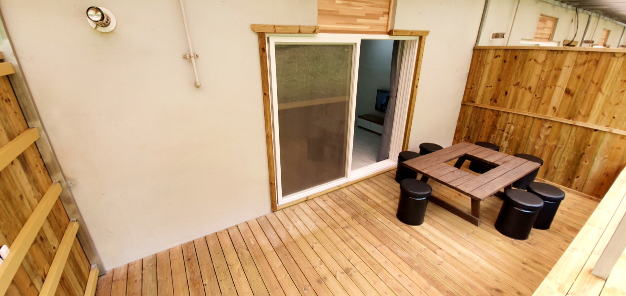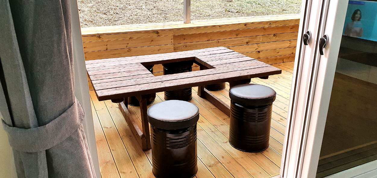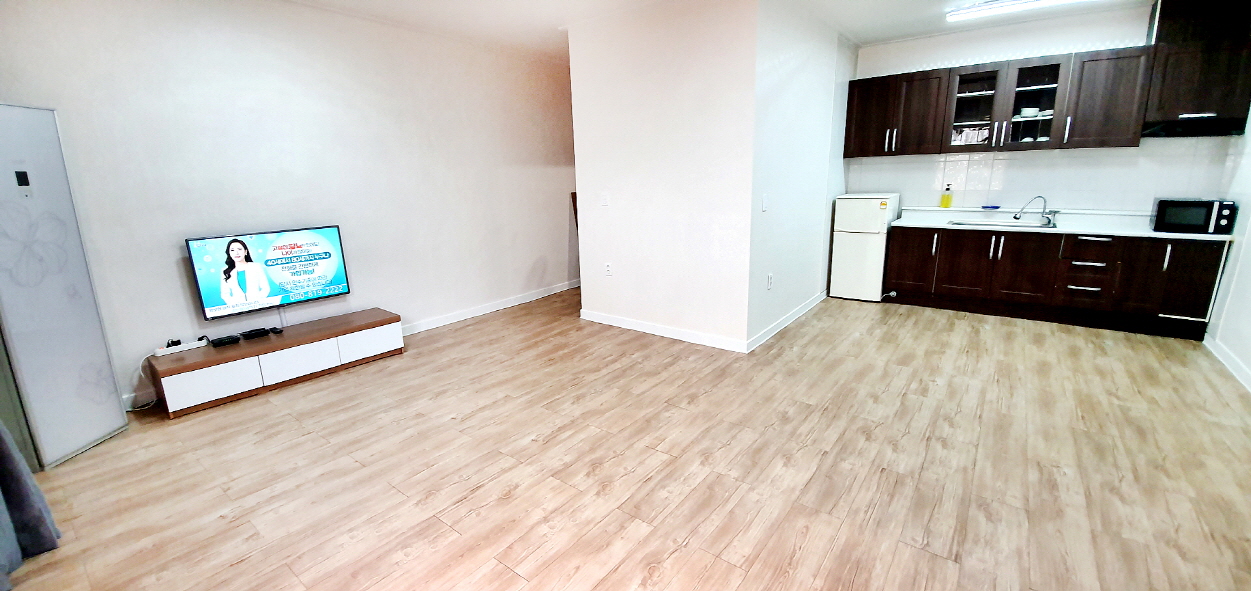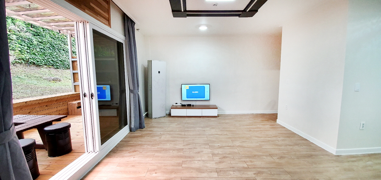 TV, 냉장고, 식탁, 에어콘, 전자렌지, 데크, 싱크대, 취사도구 일체