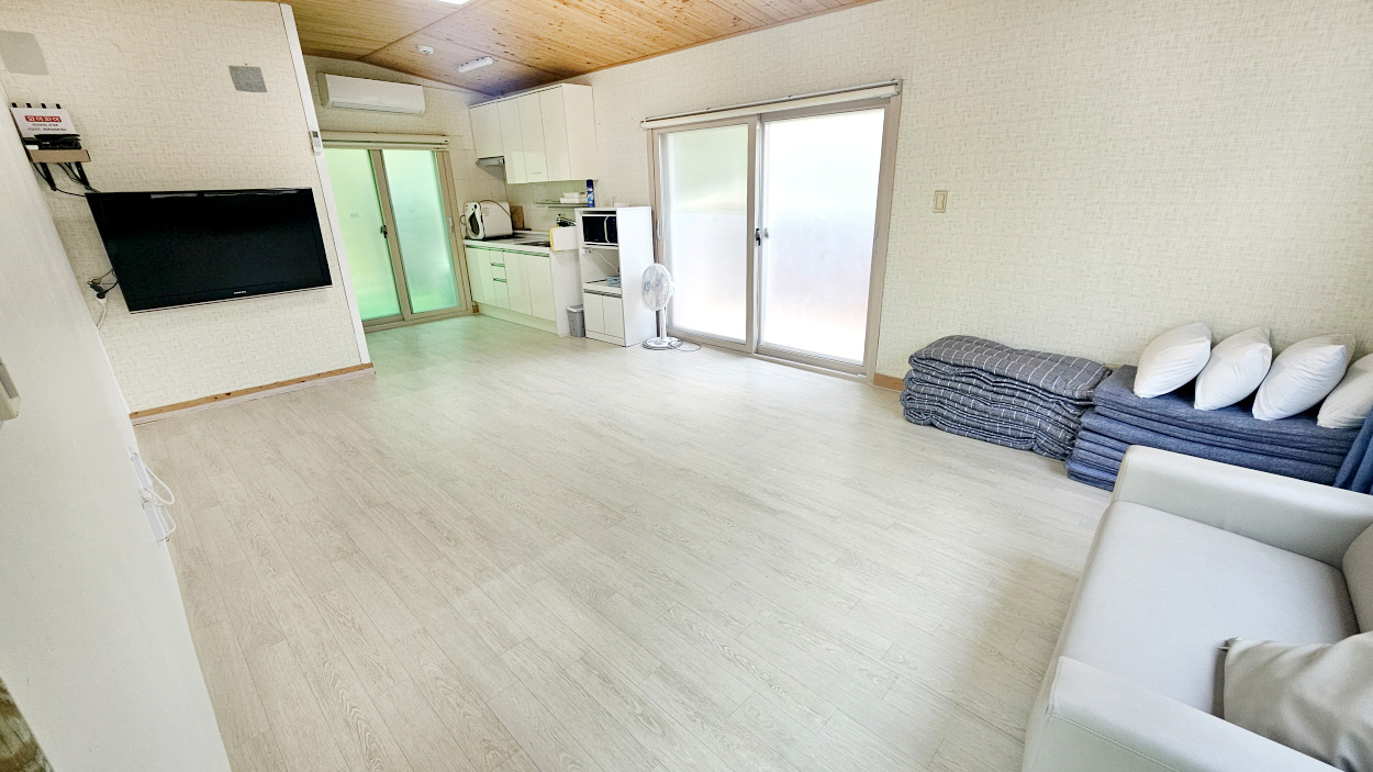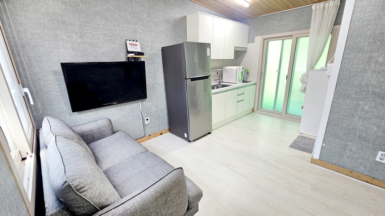 TV, 냉장고, 식탁, 에어콘, 전자렌지, 데크, 싱크대, 취사도구 일체
